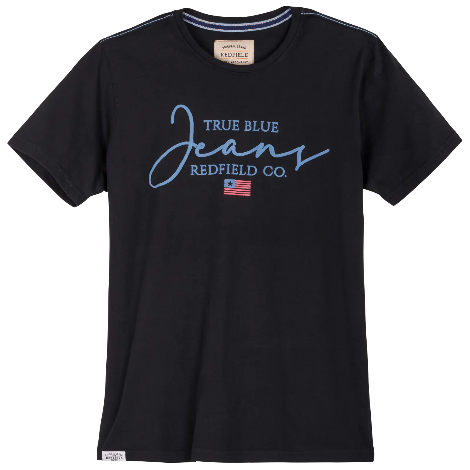 Redfield grote maat t-shirt korte mouw en ronde hals zwart True Blue Jeans. T-shirt korte mouw en ronde hals met opdruk. De kwaliteit is 100% katoen.