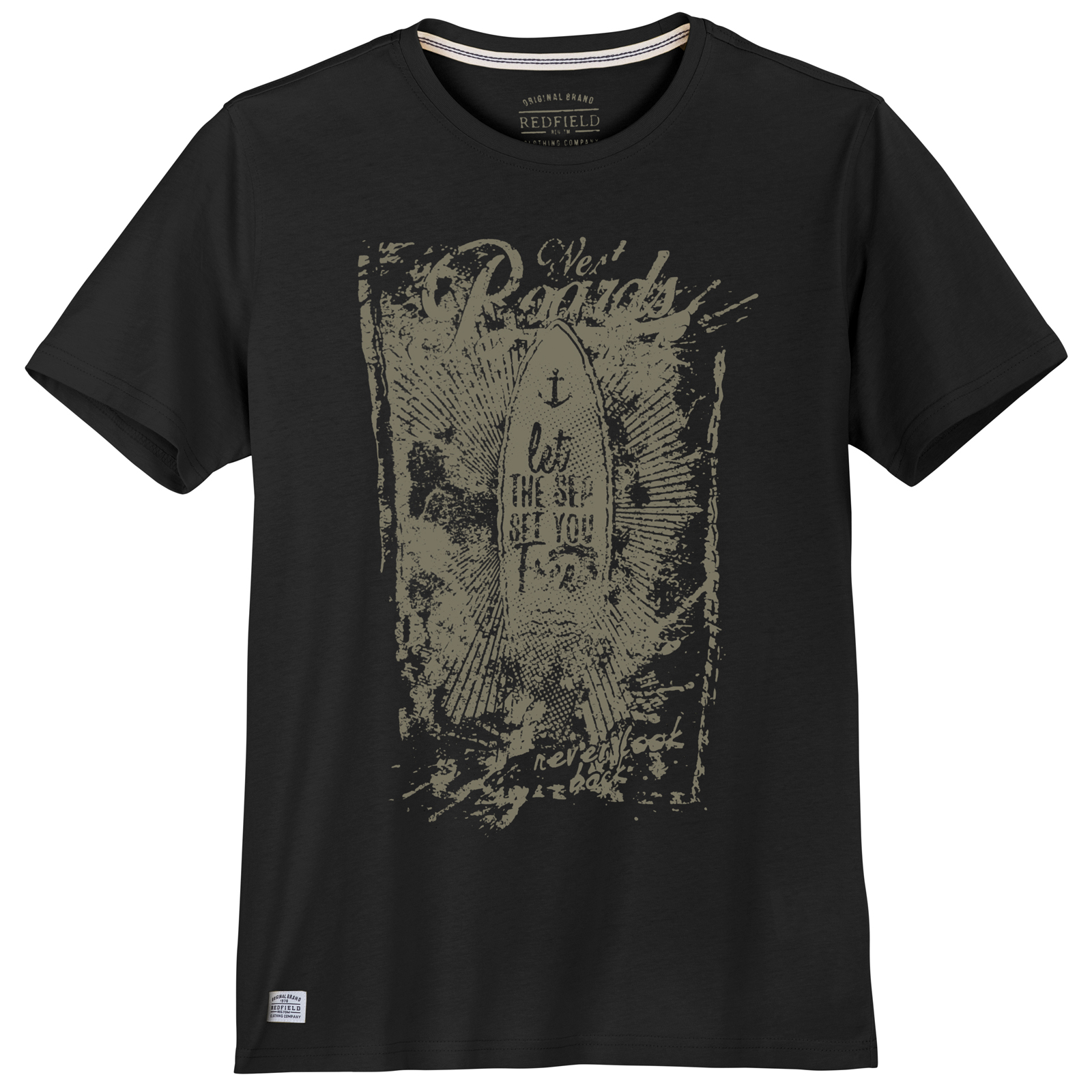 Redfield t-shirt korte mouw en ronde hals in zwart met een surf design. De kwaliteit is 100% katoen.