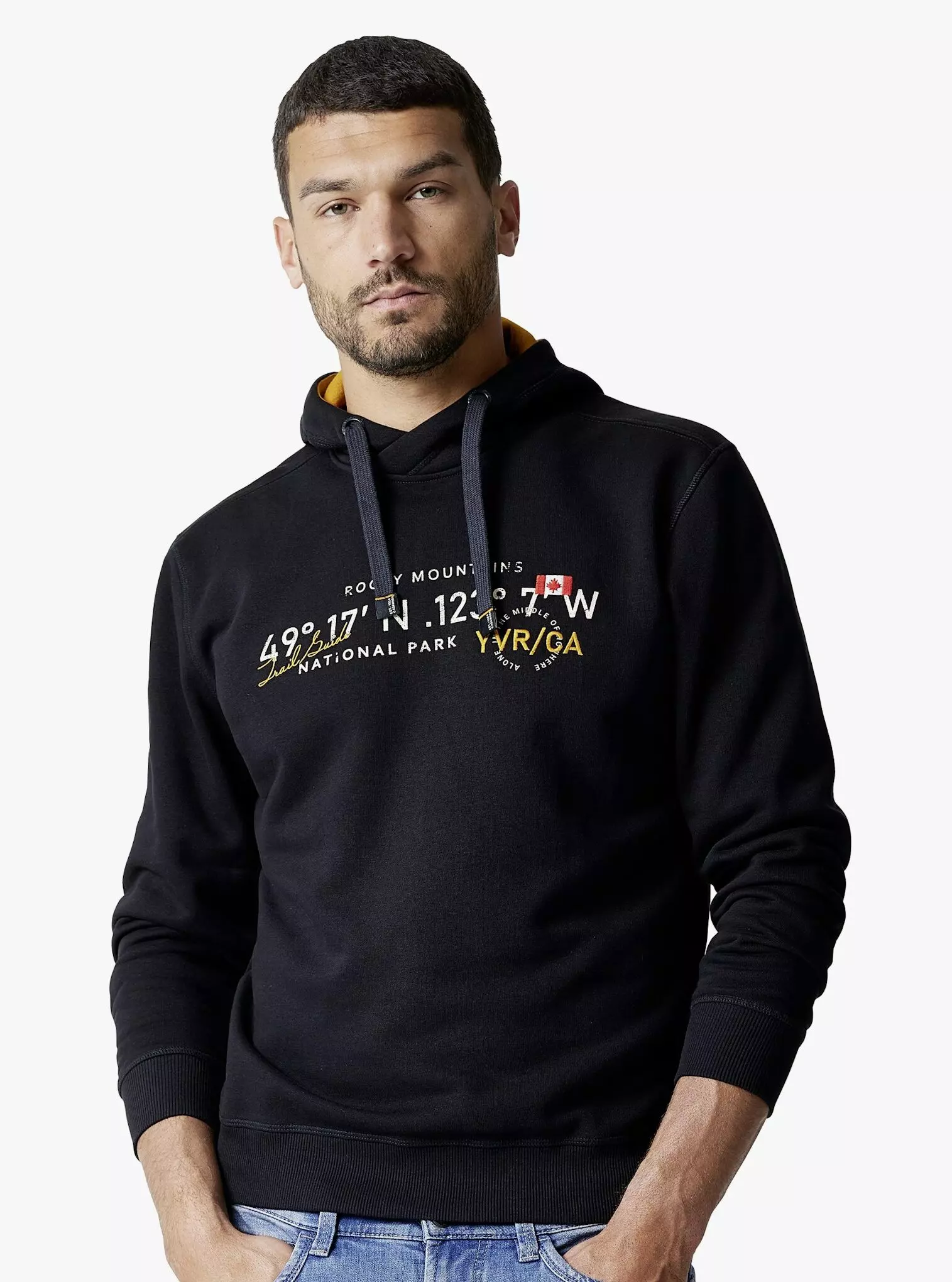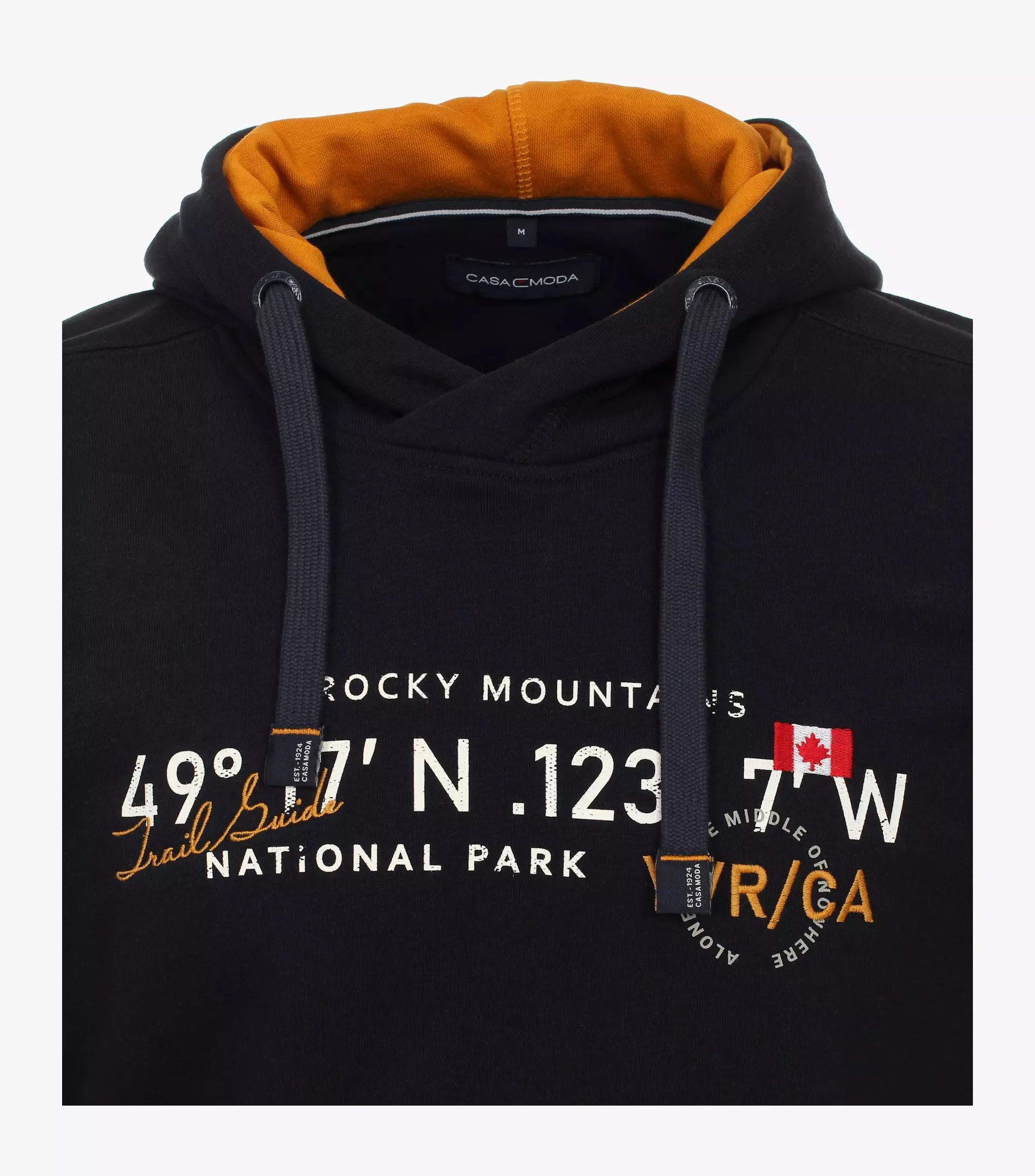 Casa Moda hoodie sweater donkerblauw Rocky Mountains. Sportieve hoodie in donkerblauw met print. De kwaliteit is 70% katoen en 30% polyester.