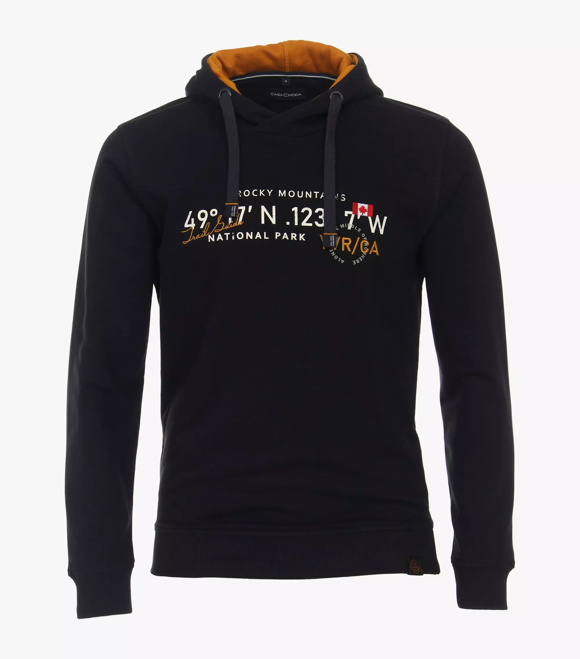 Casa Moda hoodie sweater donkerblauw Rocky Mountains. Sportieve hoodie in donkerblauw met print. De kwaliteit is 70% katoen en 30% polyester.