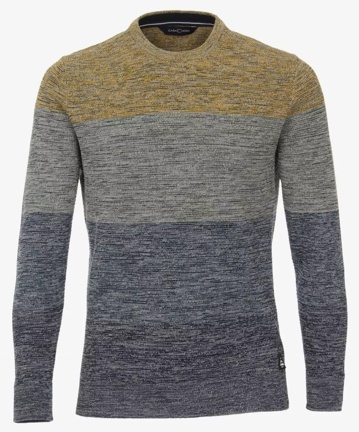 Casa Moda ronde hals trui in okergeel, groen en blauw design. De kwaliteit is 100% katoen.