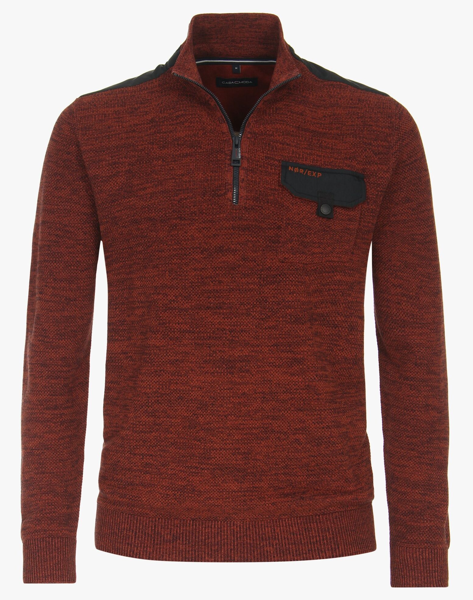 Casa Moda gebreide troyer met ingeweven structuurtje in rood met borstzak en schouderstukken. Trui in 100% katoen.