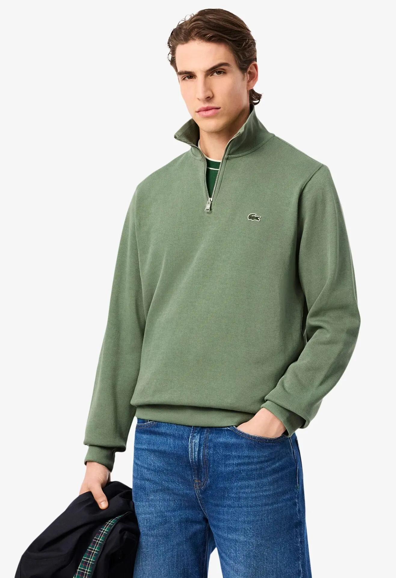 Lacoste interlock sweater van geribbeld katoen groen. Lacoste sweater met zijzakken en schippers kraag met rits.