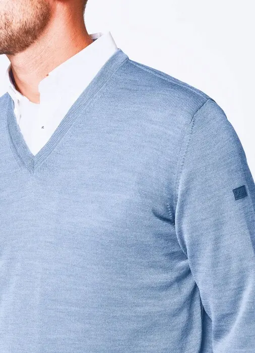 Maerz V-hals trui in lichtblauw. Deze tijdloze trui is fijn te dragen over een T-shirt of overhemd. De kwaliteit is 100% merino wol. Machine wasbaar 30graden.