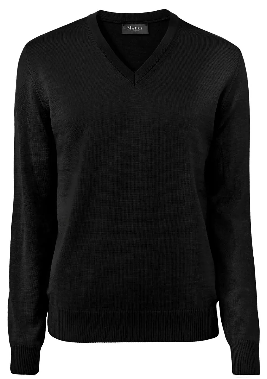 Maerz v-hals trui in zwart. De kwaliteit is 100% merino wol. Machine wasbaar 30graden.