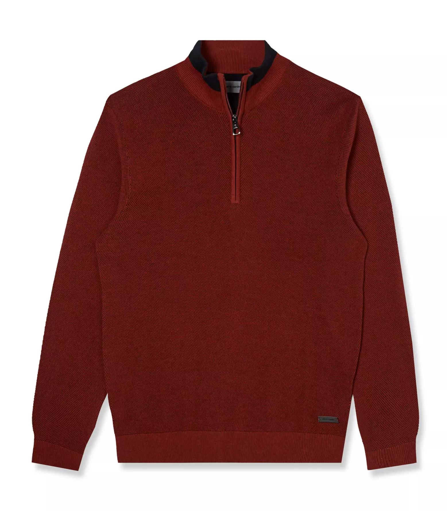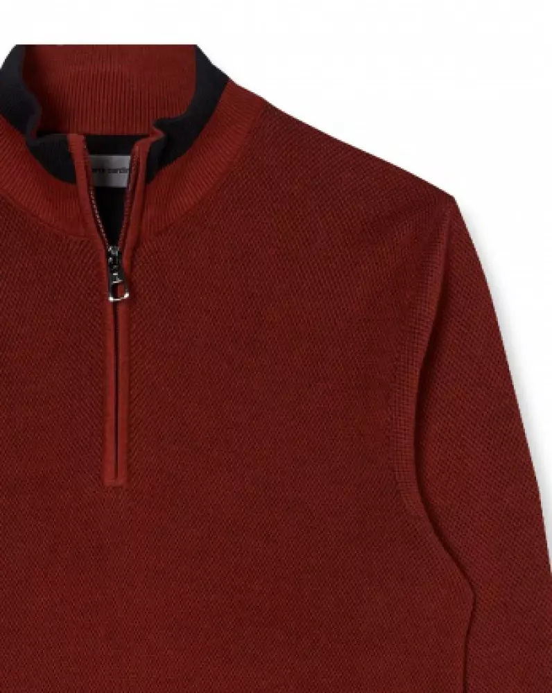 Pierre Cardin lange mouw trui met collegekraag rits in donkerrood met boord. De kwaliteit is 100%katoen.
