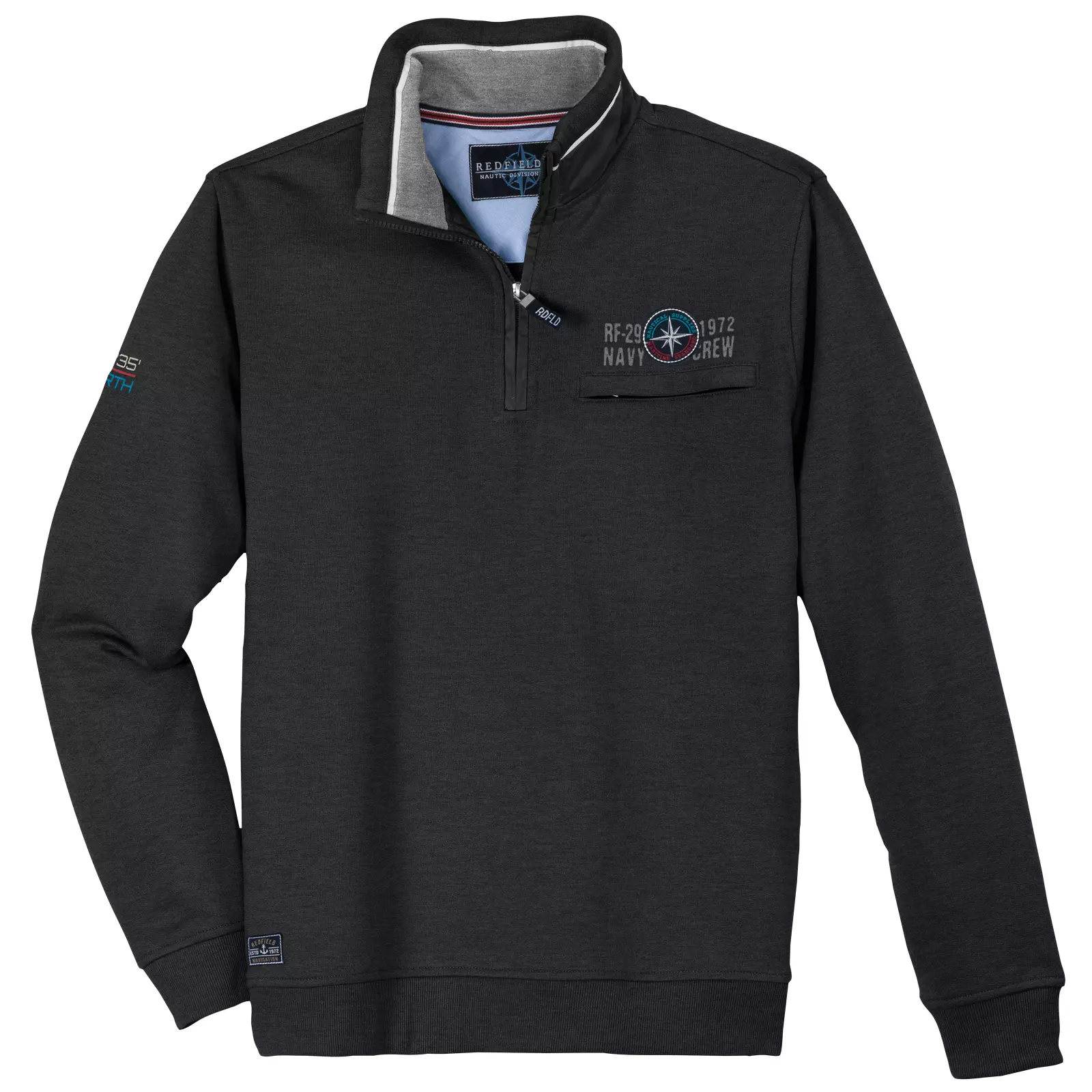 Redfield sweater donkergrijs Navy Crew. Sweater met sportieve applicatie en borstzakje met rits in 70%katoen en 30%polyester.