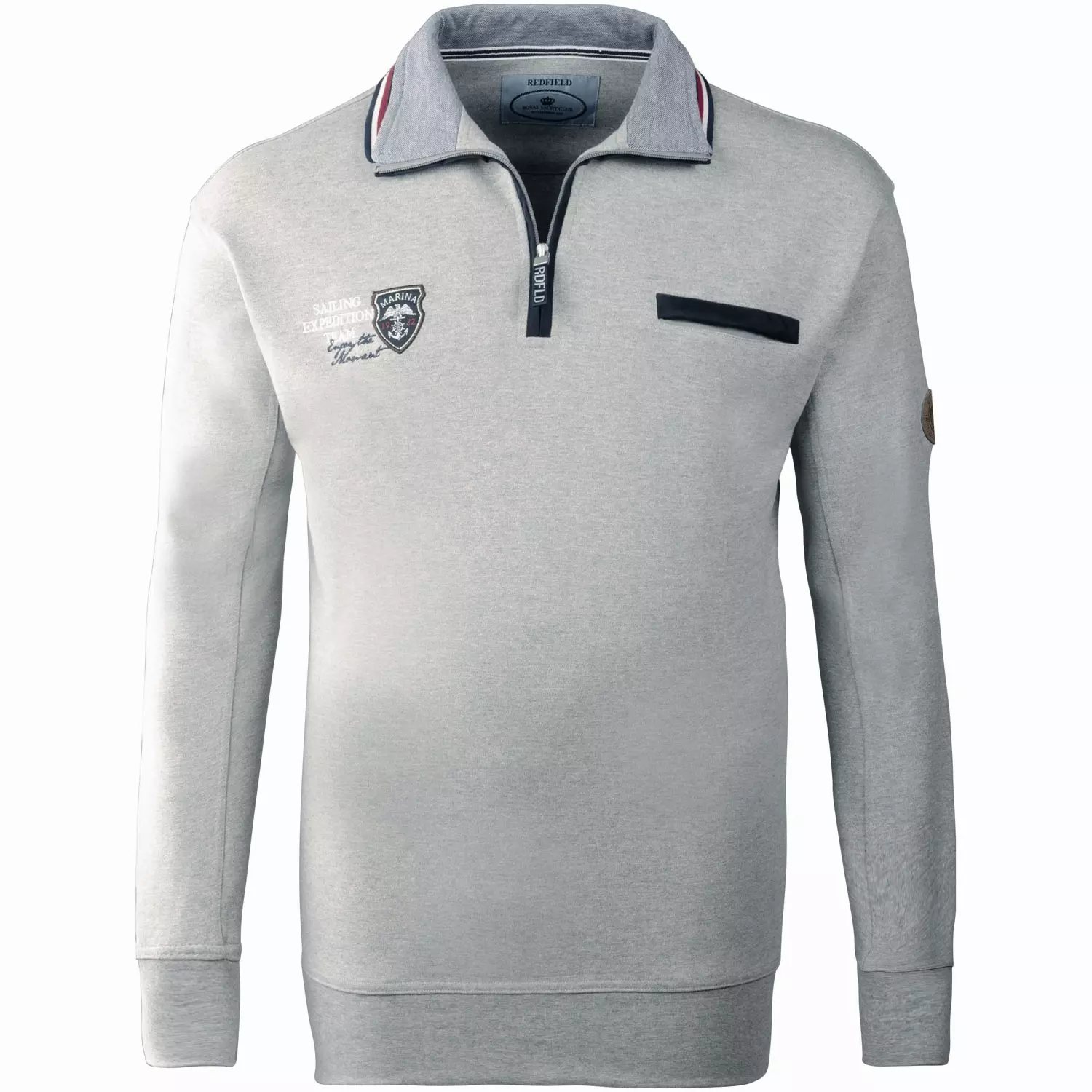 Redfield sweater met polokraag rits in grijs. Redfield sportieve sweater met tricot manchetten en boord. Op de rechterkant van de borst een sportieve applicatie en de linkerkant een borstzakje. De kwaliteit is 100%katoen machine wasbaar.