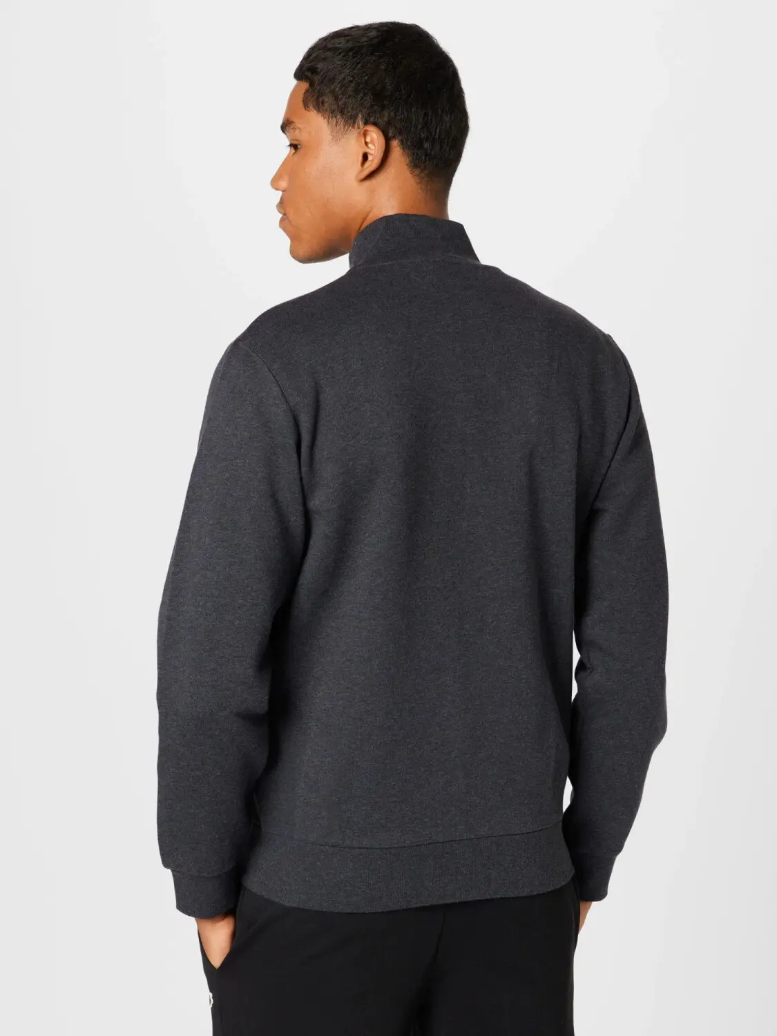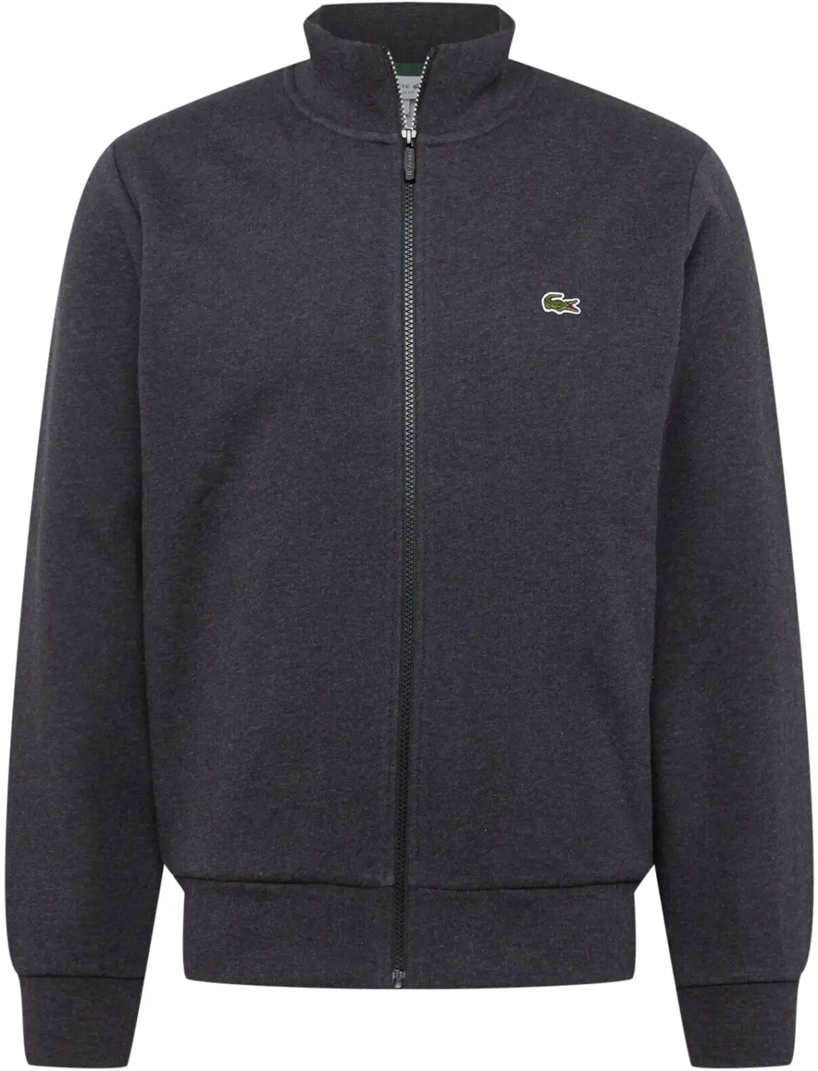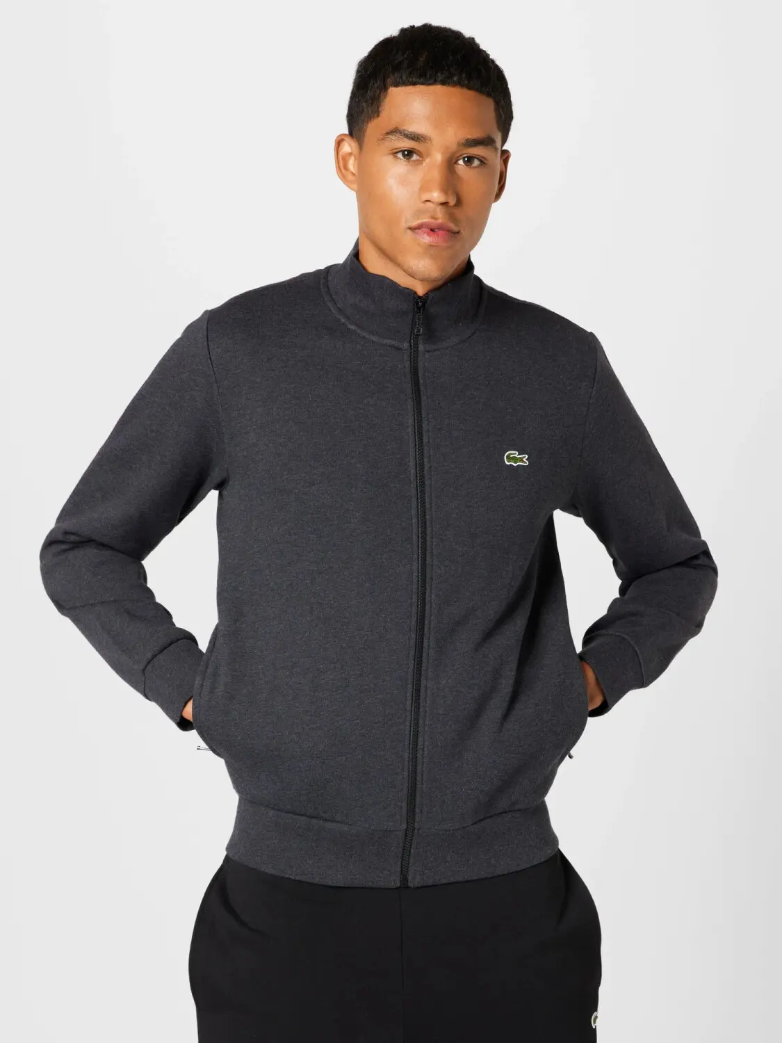 Lacoste sportvest in donkergrijs, 2 zijzakken met ritssluiting. Ruim vallend niet getailleerd. De kwaliteit van dit vest is 84% katoen en 16% polyester