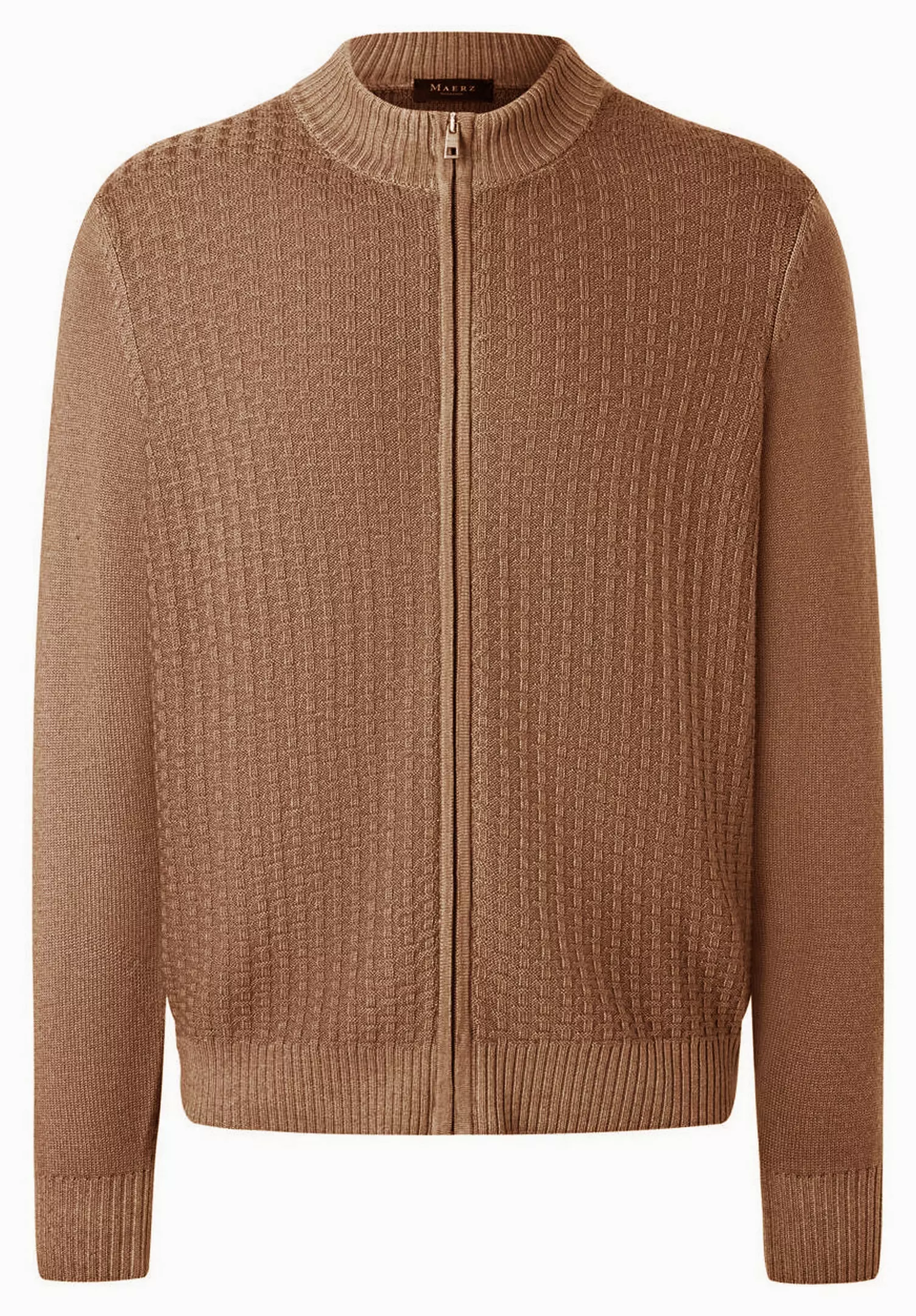 Maerz vest camel met ingeweven structuur. Voor wanneer alleen een overhemd net iets te fris is, is dit vest een uitkomst. Vest met college kraag in camel met ritssluiting. De kwaliteit is 100% wol.