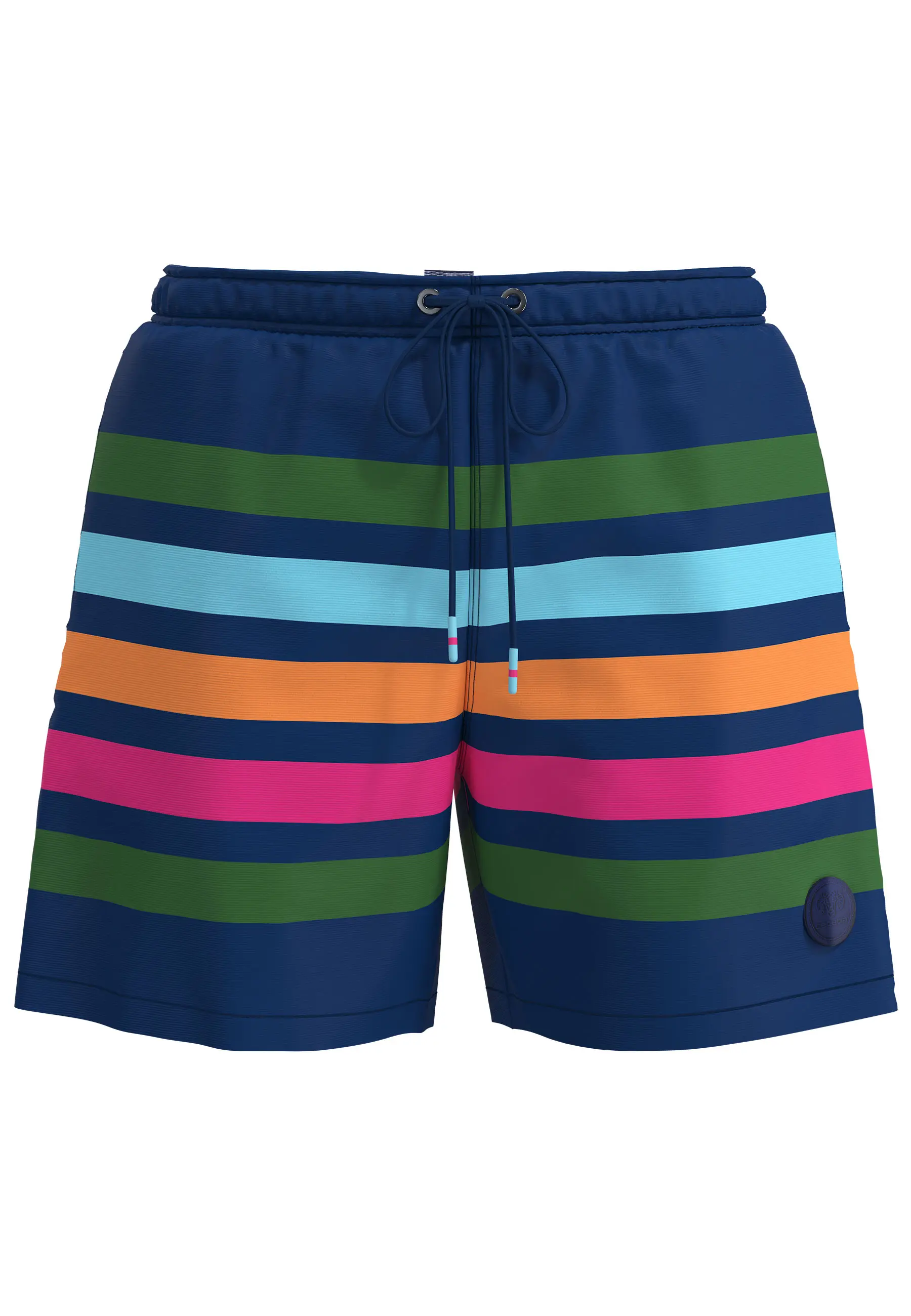 Ceceba zwemshort blauw met horizontale gekleurde banen. Ceceba zwemshort met gazen binnenbroek, 2 zijzakken en een achterzak. In de elastisch band zit een aantrek koord om de zwemshort strakker aan te trekken. Zwemshort in snel drogende stof 100% polyester.