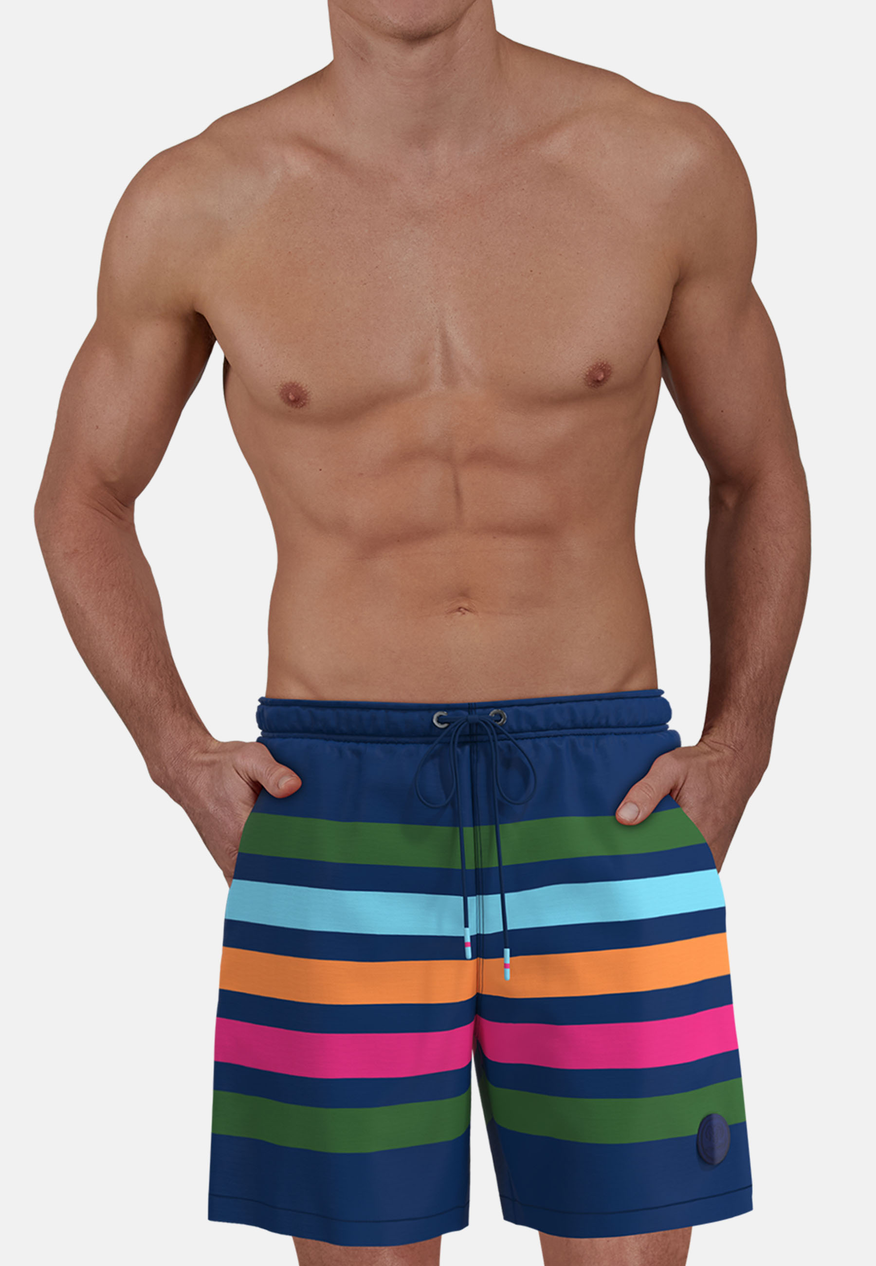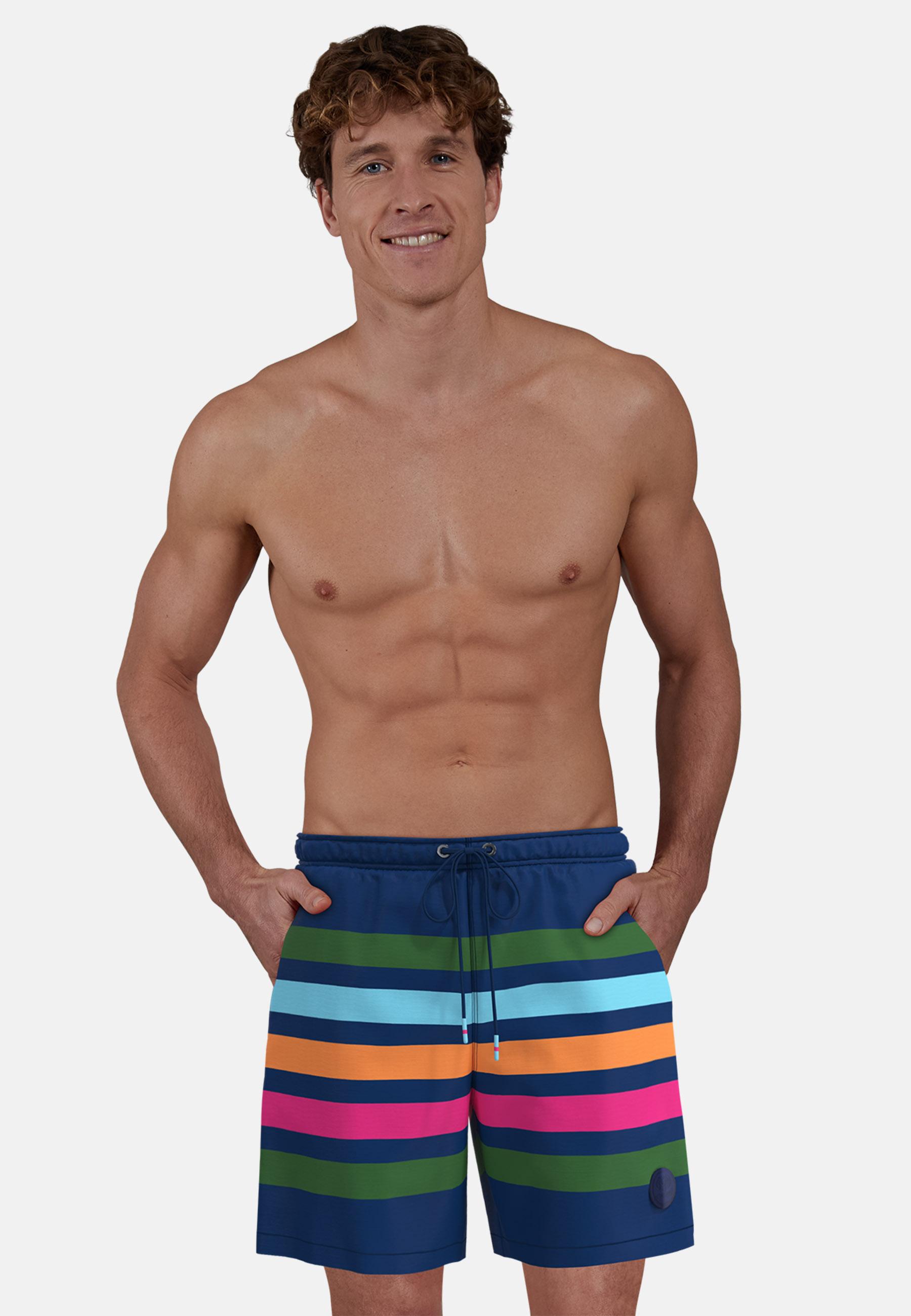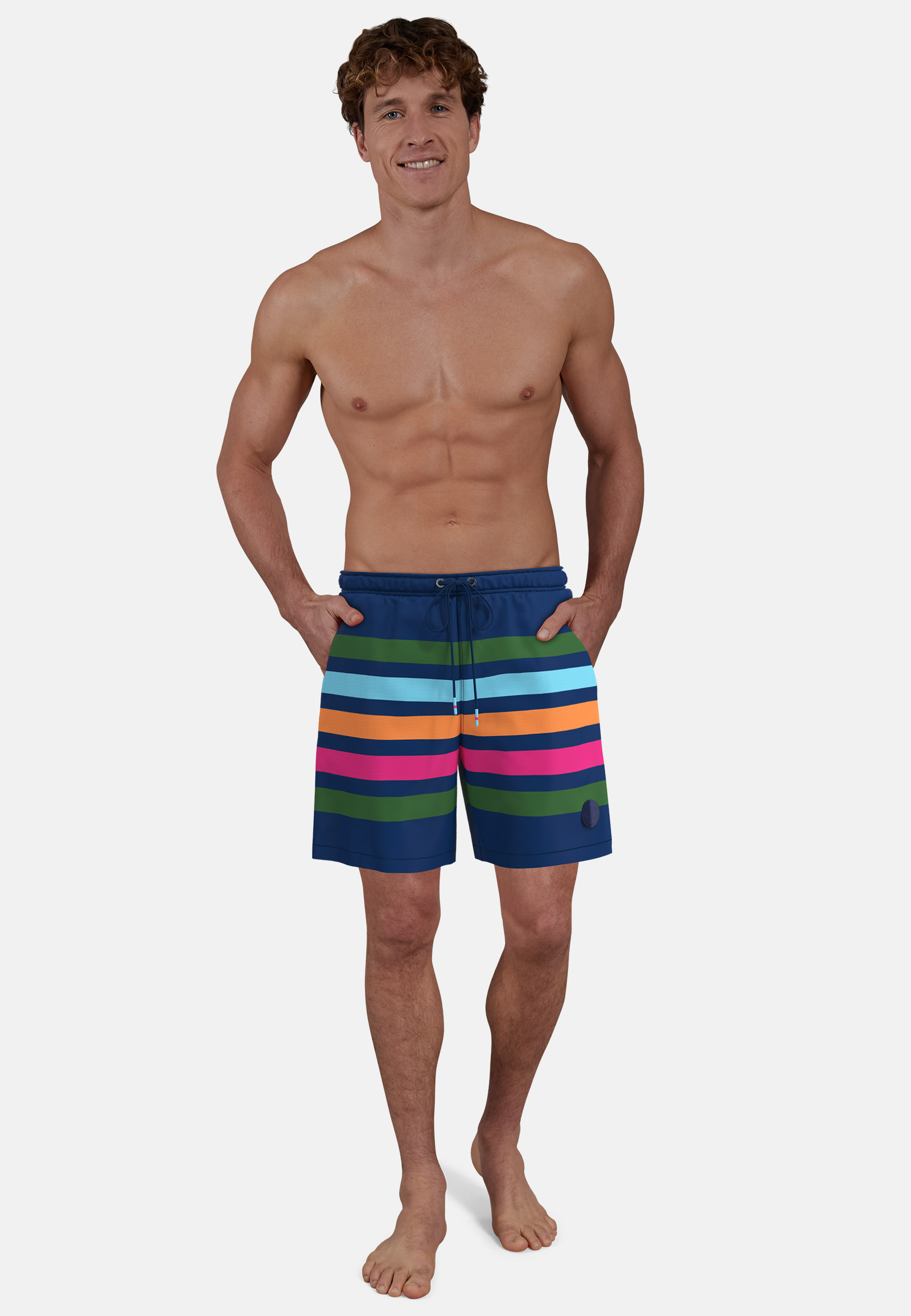 Ceceba zwemshort blauw met horizontale gekleurde banen. Ceceba zwemshort met gazen binnenbroek, 2 zijzakken en een achterzak. In de elastisch band zit een aantrek koord om de zwemshort strakker aan te trekken. Zwemshort in snel drogende stof 100% polyester.