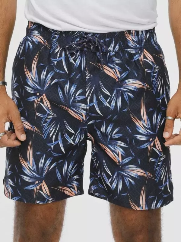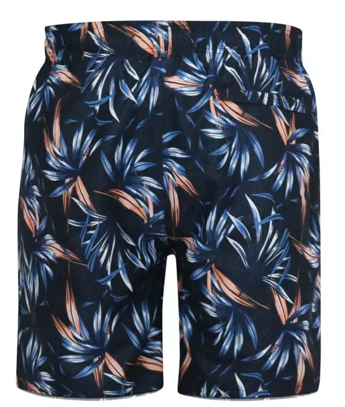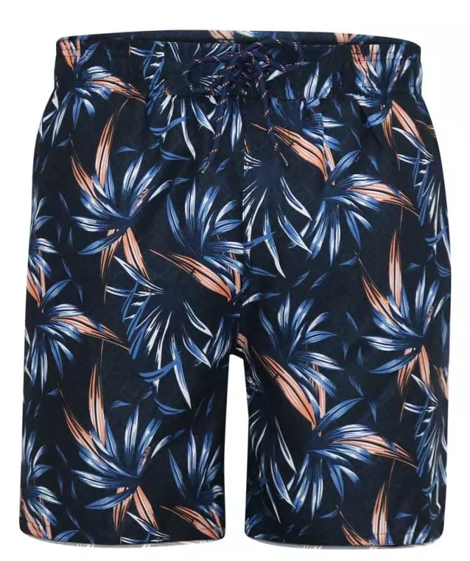 D555 zwemshort in donkerblauw Hawaii design. Zwemshort heeft een achterzak met rits, twee steekzakken aan de voorkant en een tunnel koord om de short strakker aan te trekken in sneldrogende stof.