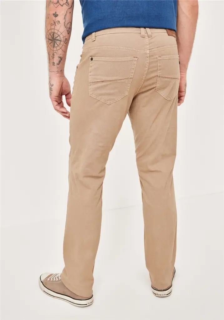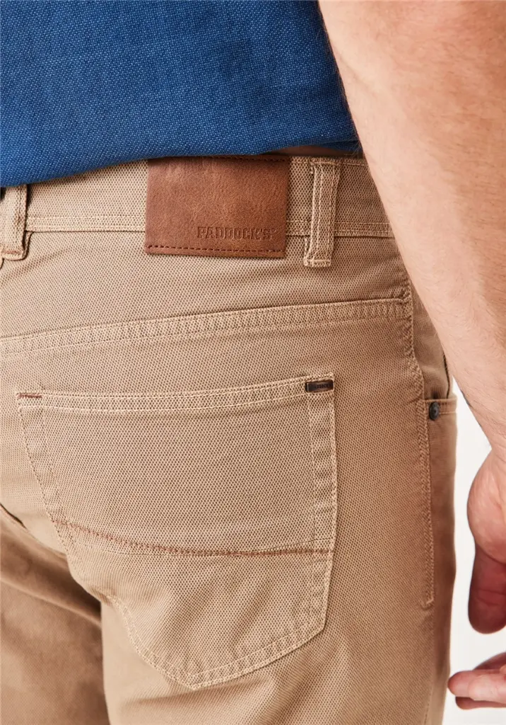 Paddock 5 pocket casual stretch jeans in beige met ingeweven design. Casual 5 pocket broek in model Pipe tapered leg, mid rise. De kwaliteit is 98% katoen en 2% elastan.