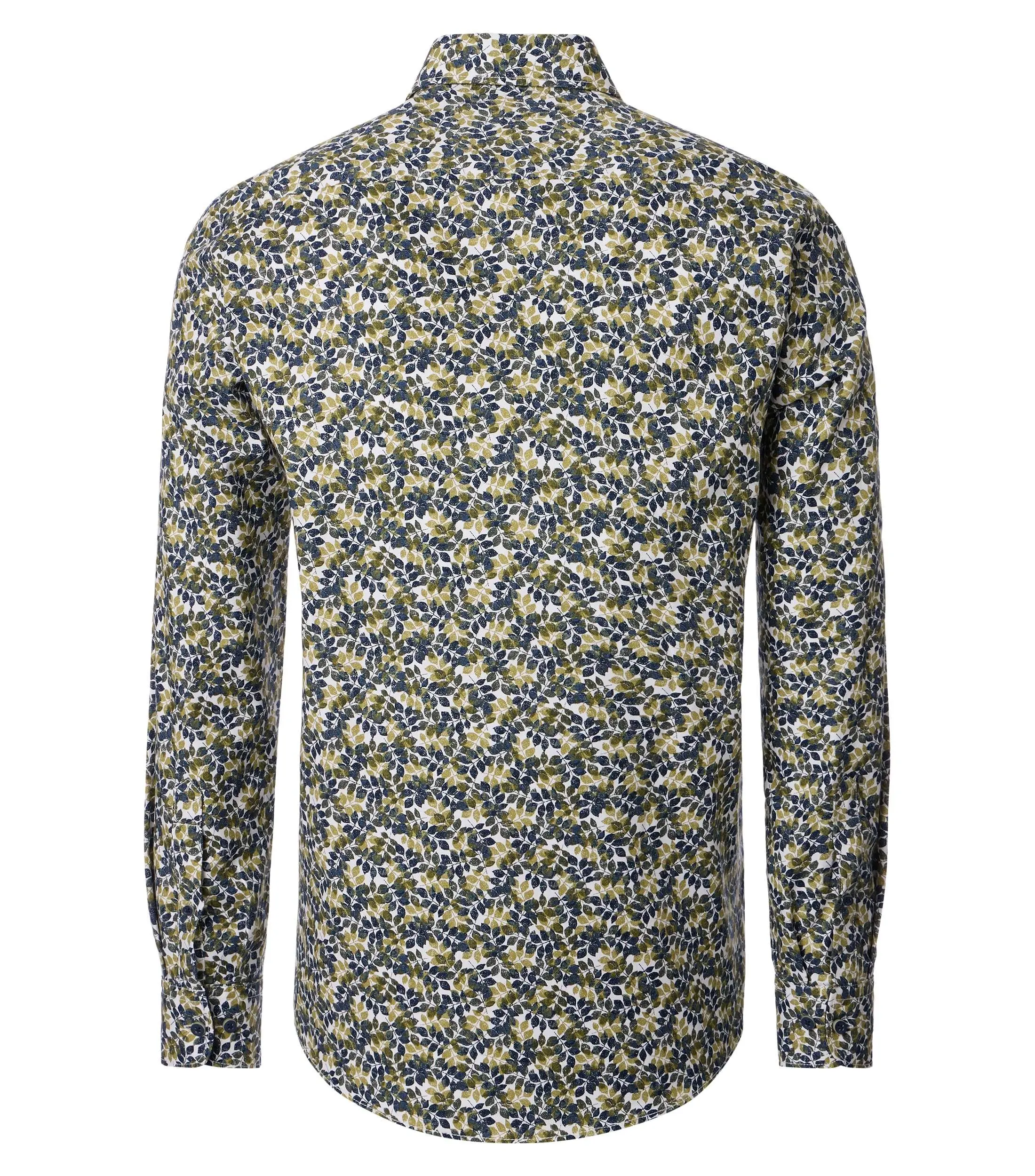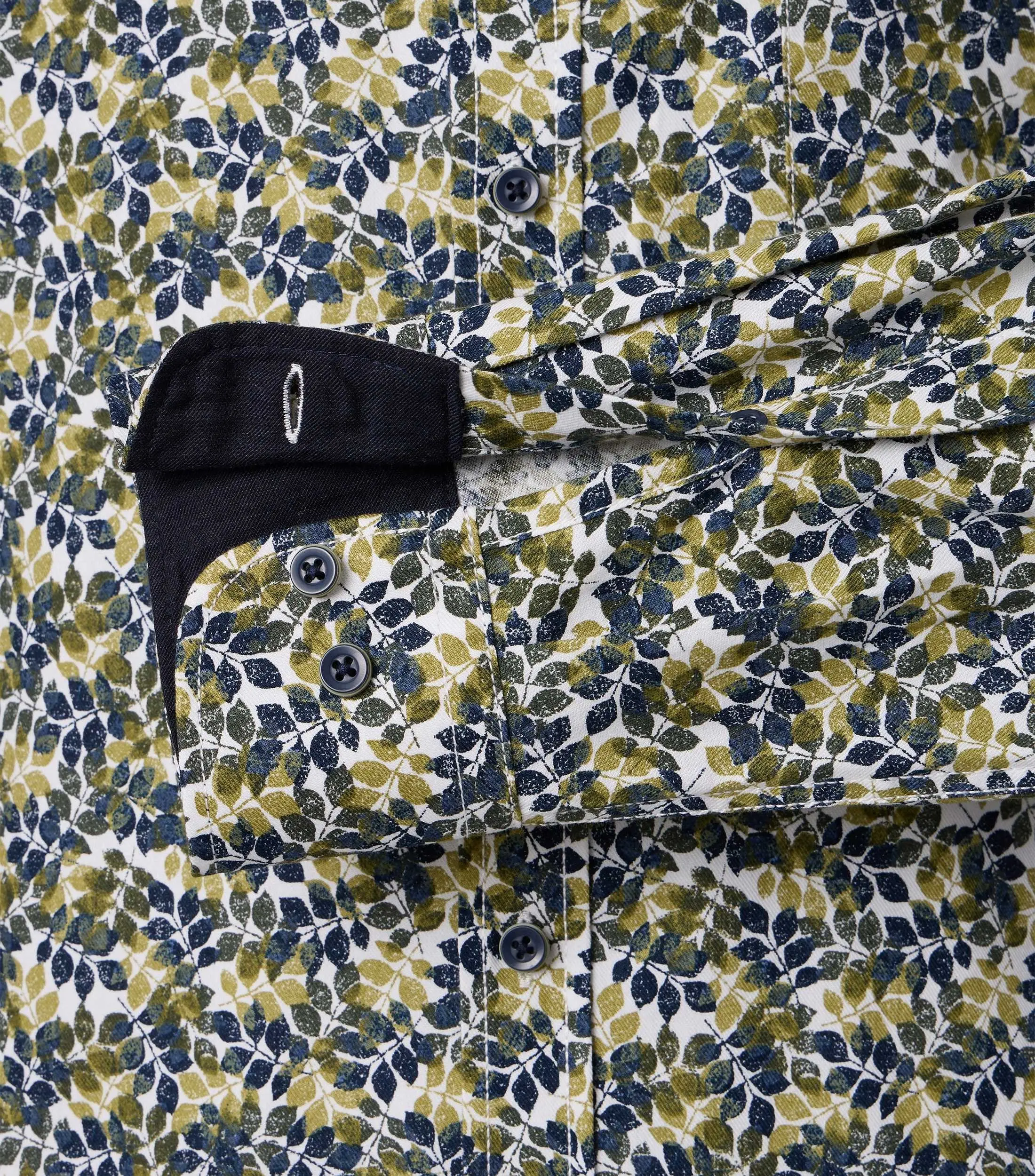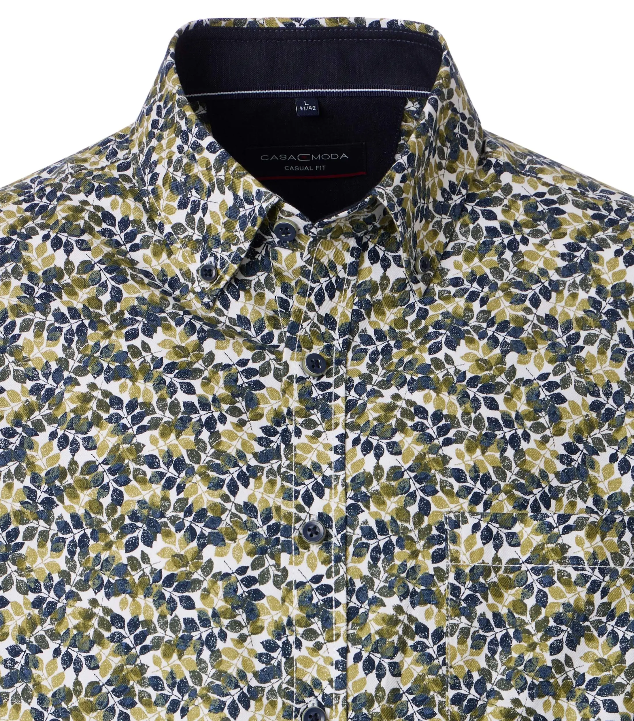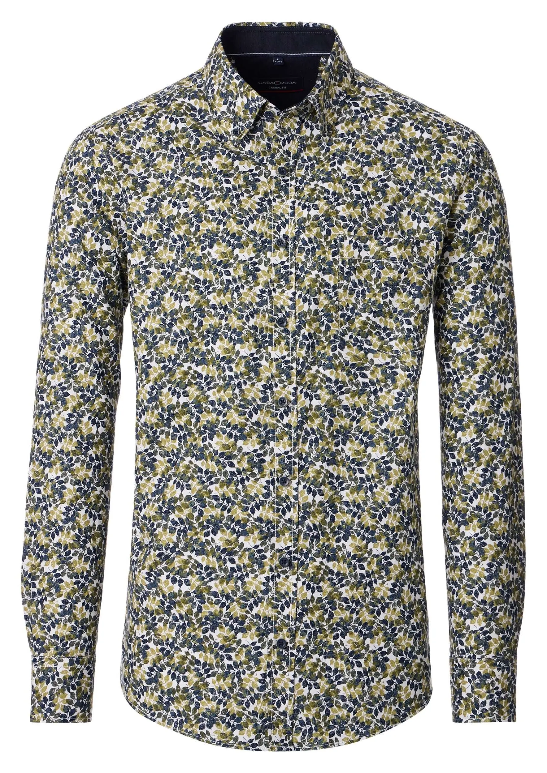 Casa Moda mouwlengte7 overhemd olijfgroen, blauw en bruin blad design. Overhemd met borstzak en kraag button down in model casual fit 100% katoen easy care.