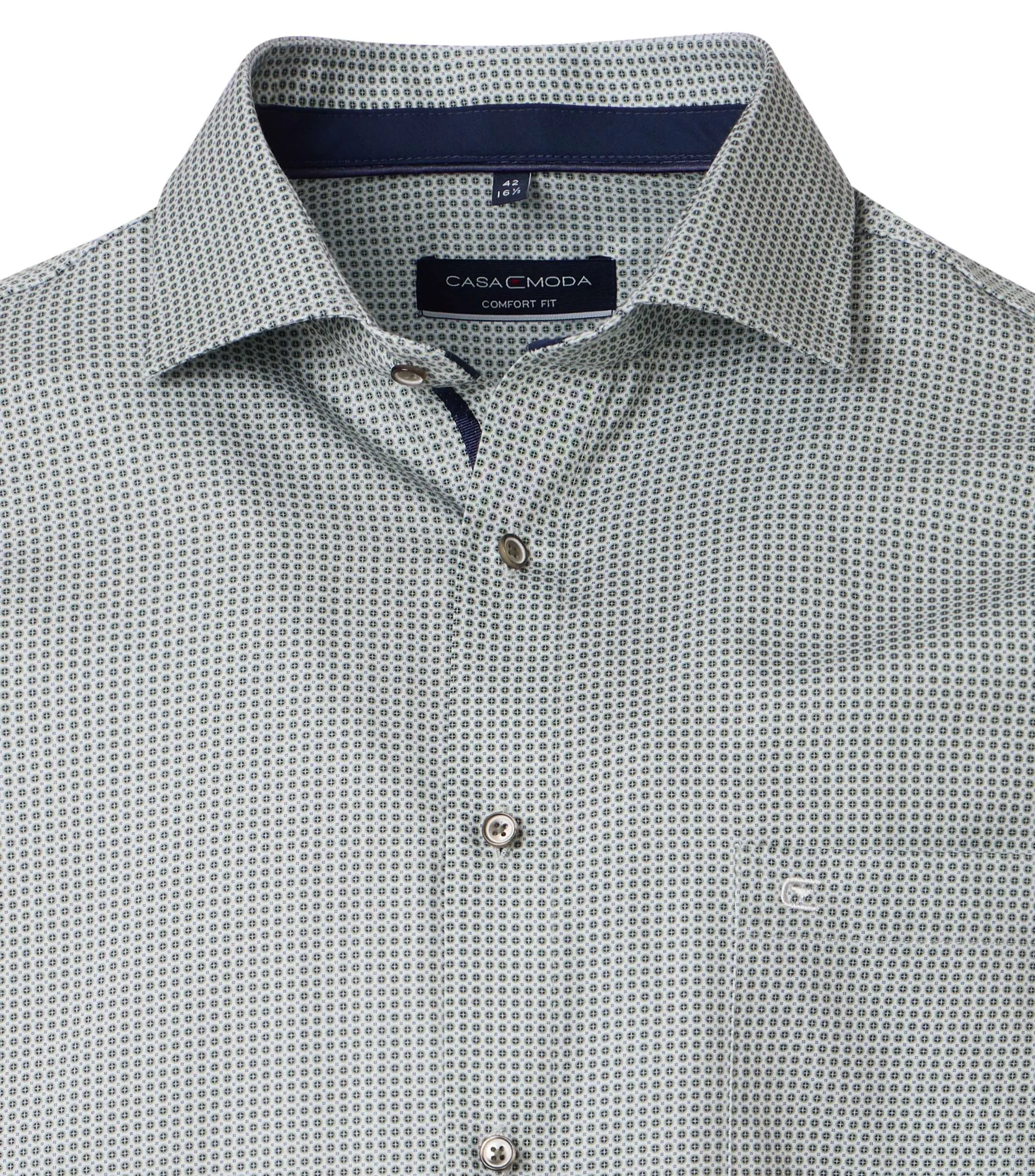 Casa Moda overhemd 72cm mouwlengte7 groen, wit en blauw fantasie design. Binnenkant kraag en manchetten zijn met een contrasterend stofje afgewerkt. Model comfort fit 100% katoen easy care.
