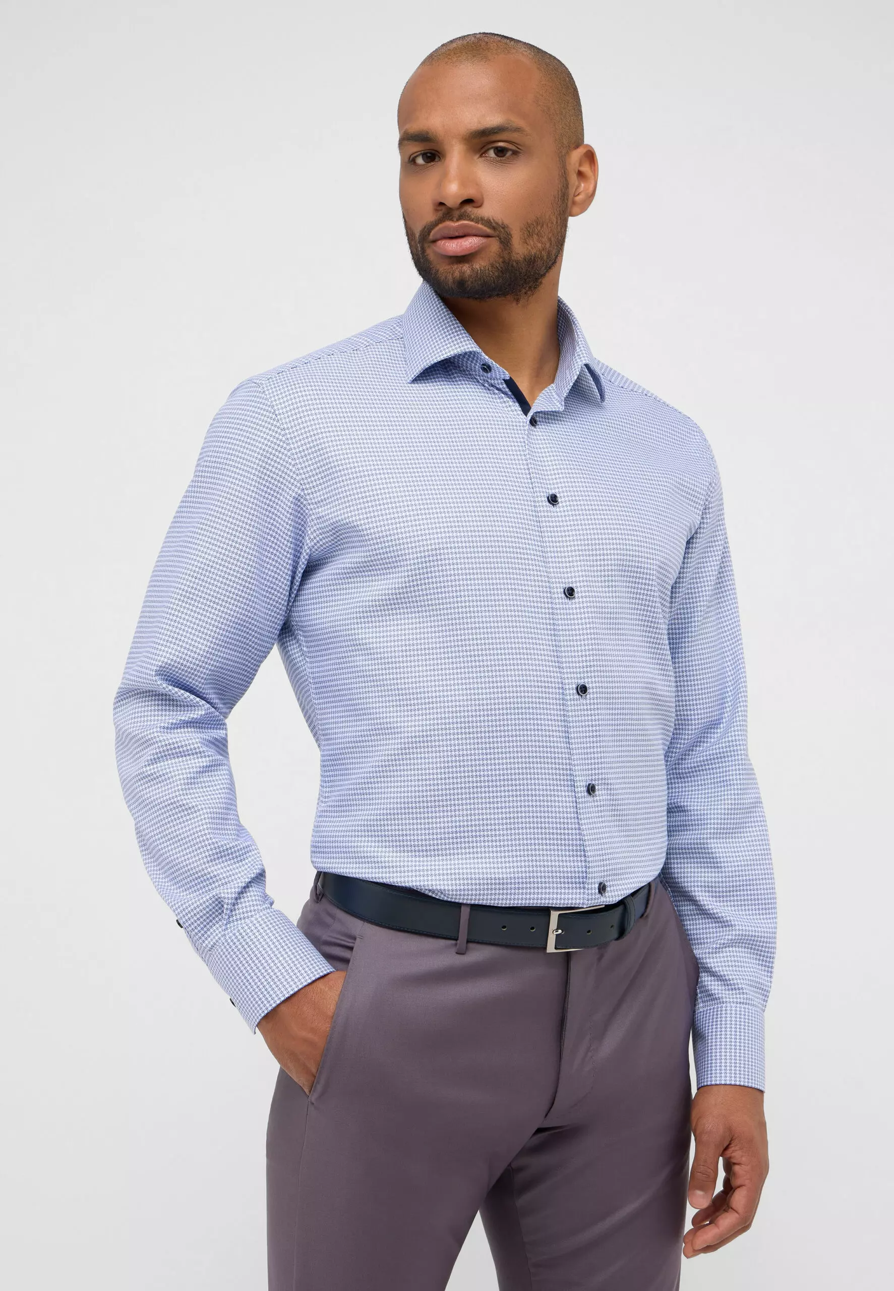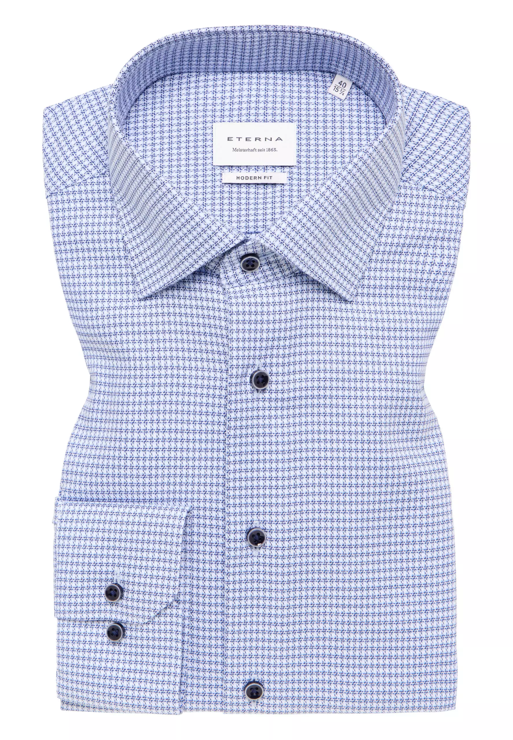 Eterna overhemd extra lange mouw blauw fantasie blokjes design strijkvrij. Eterna overhemd mouwlengte7 met borstzakje in model comfort fit 100%katoen strijkvrij.