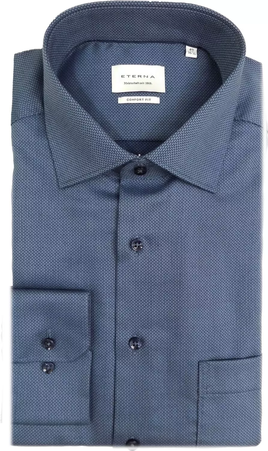 Eterna overhemd extra lange mouw donkerblauw fantasie design strijkvrij. Eterna overhemd mouwlengte7 met borstzakje in model comfort fit 100%katoen strijkvrij.