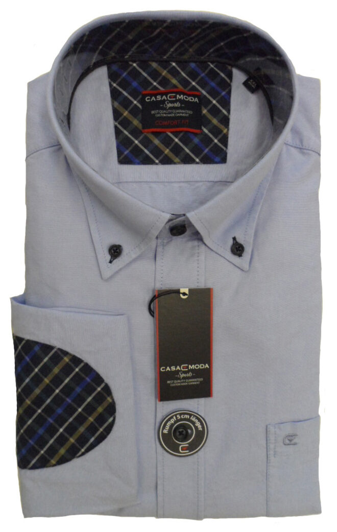 Casa Moda overhemd lange met borstzakje in lichtblauw met elleboog stukken. Binnenkant kraag en manchetten zijn afgewerkt met een contrasterend stofje. Overhemd met kraag button down in 100% katoen model comfort fit.