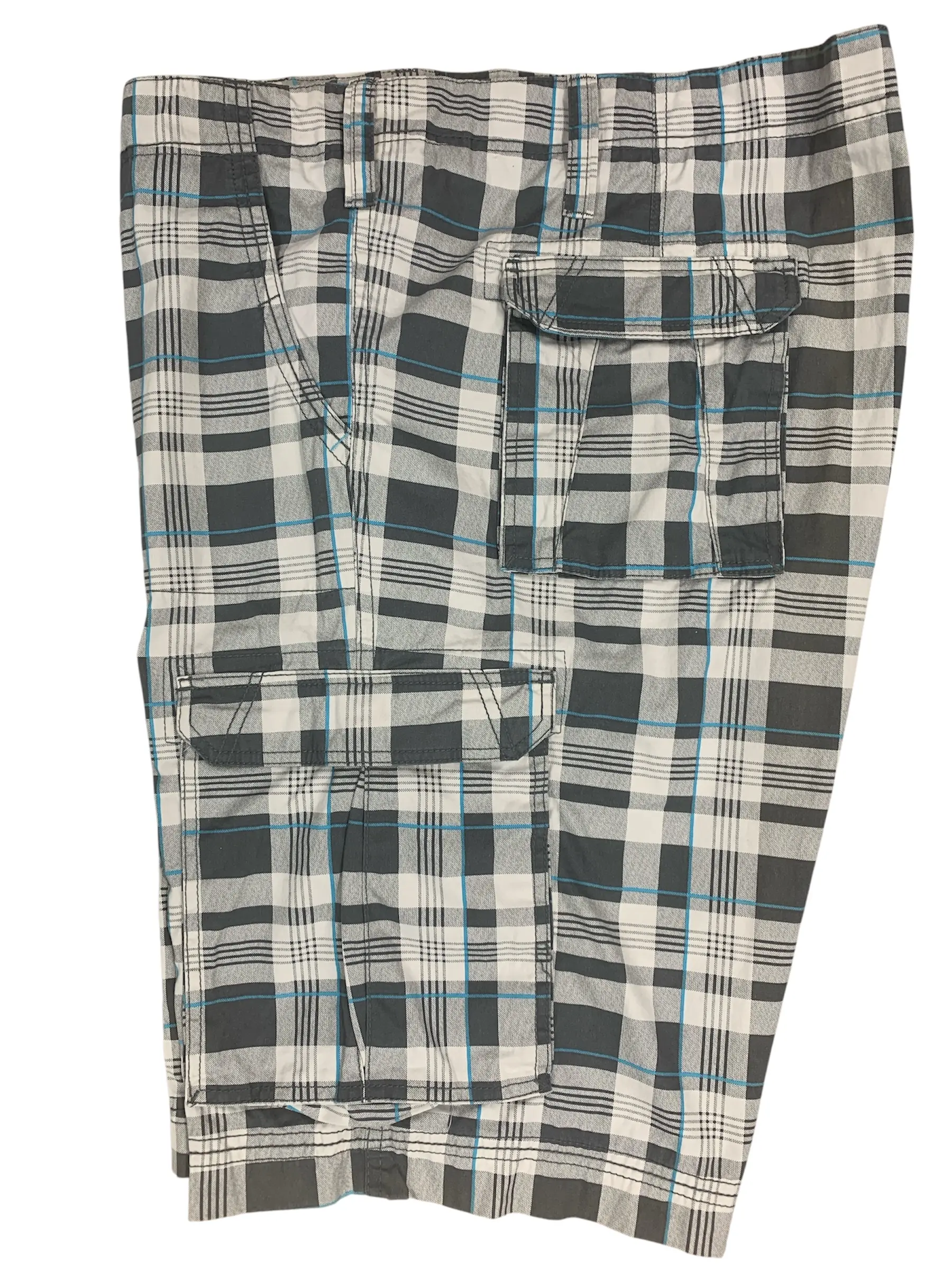 Het Broekenpaleis korte broek grijs, wit en blauwe ruit. Sportieve bermuda met twee achter klep zakken met knoop, voor en zijzakken. De kwaliteit is 100% katoen.