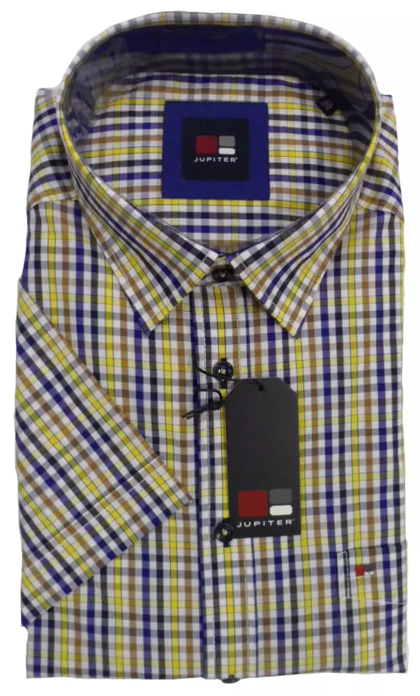 Jupiter overhemd korte mouw met borstzakje in een blauw, beige, wit en geel ruitje. De kwaliteit van dit overhemd is 100% katoen.