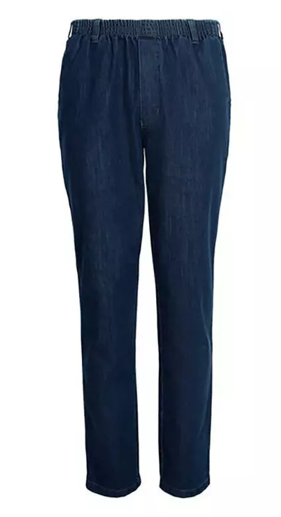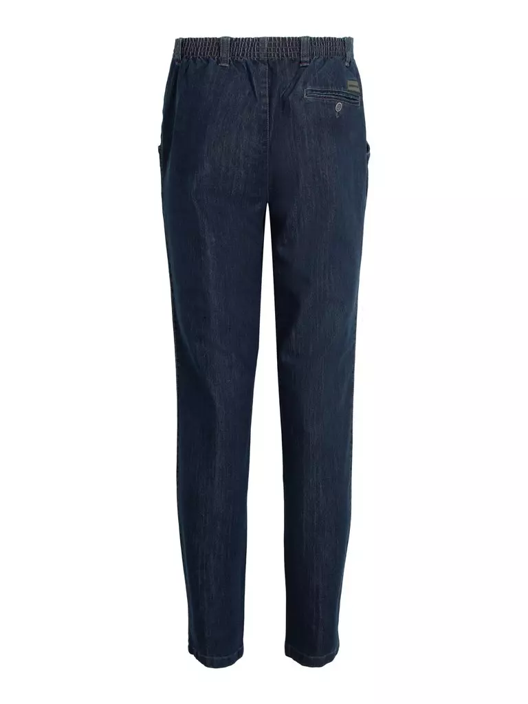 Luigi Morini denim jeans met elastische band blauw. De in principe model joggingbroek heeft geen rits en knoop sluiting, maar trekt u gewoon aan als een joggingbroek. Aan de elastische band zitten riem lussen. Deze broek heeft 2 zijzakken en 1 achterzak met knoop sluiting.